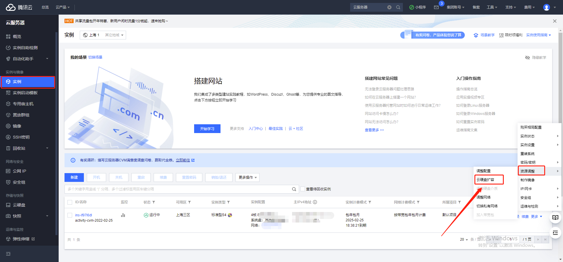 1:更多-资源调整-选择系统盘扩容。再新建一个数据盘扩容。