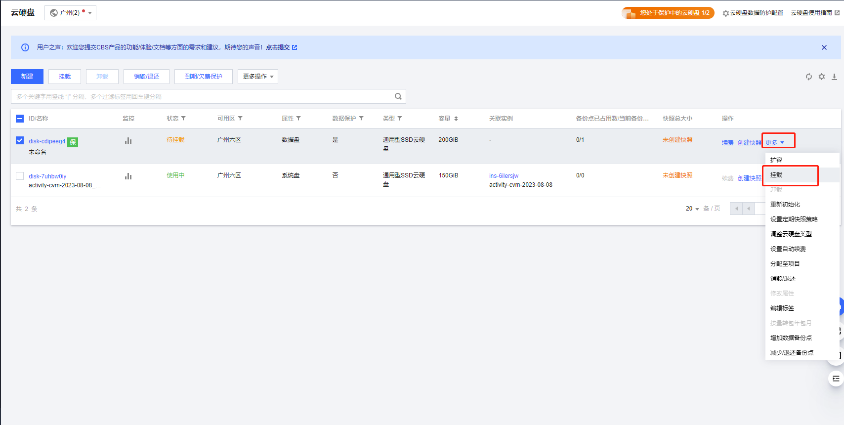 云硬盘-找到数据盘-更多-挂载