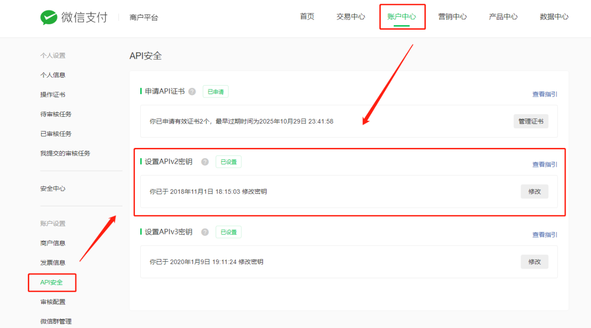 1、未设置aplv2密钥或重置aplv2密钥:登录微信商户号pay.weixin.qq.com -- 账户中心 -- api安全 -- 设置aplv2密钥,后台填写正确的密钥,注意填写时不能前后有空格.