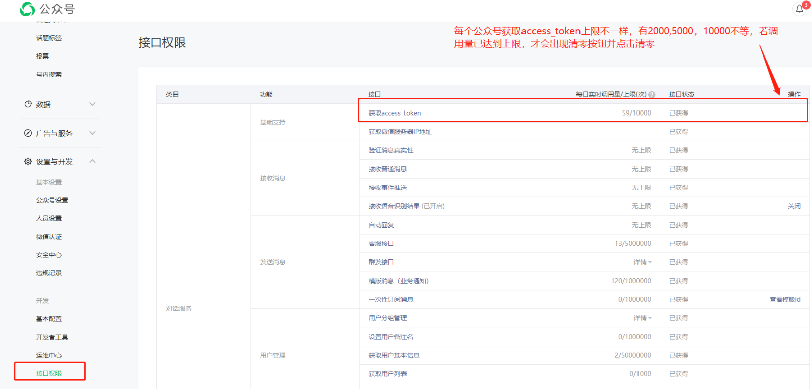 公众号 —— 登录公众平台mp.weixin.qq.com >> 设置与开发 >> 接口权限 >> 清零access_token调用量