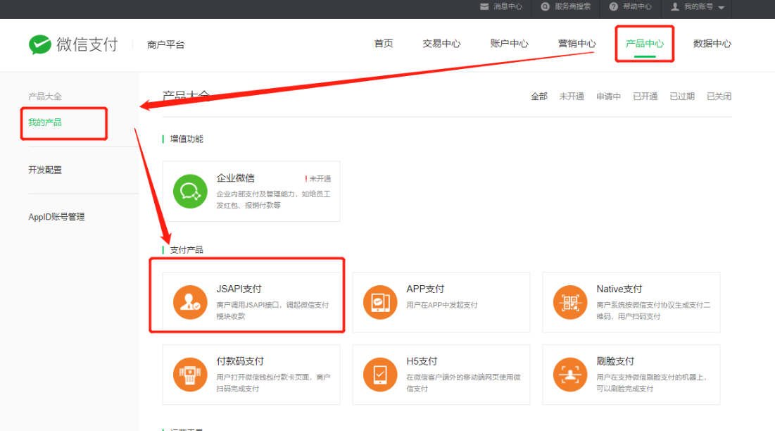 登录商户号后台pay.weixin.qq.com--产品中心--我的产品,开通JSAPI支付权限。如果有PC网站,要用到微信扫一扫支付,开通Native支付,如下图