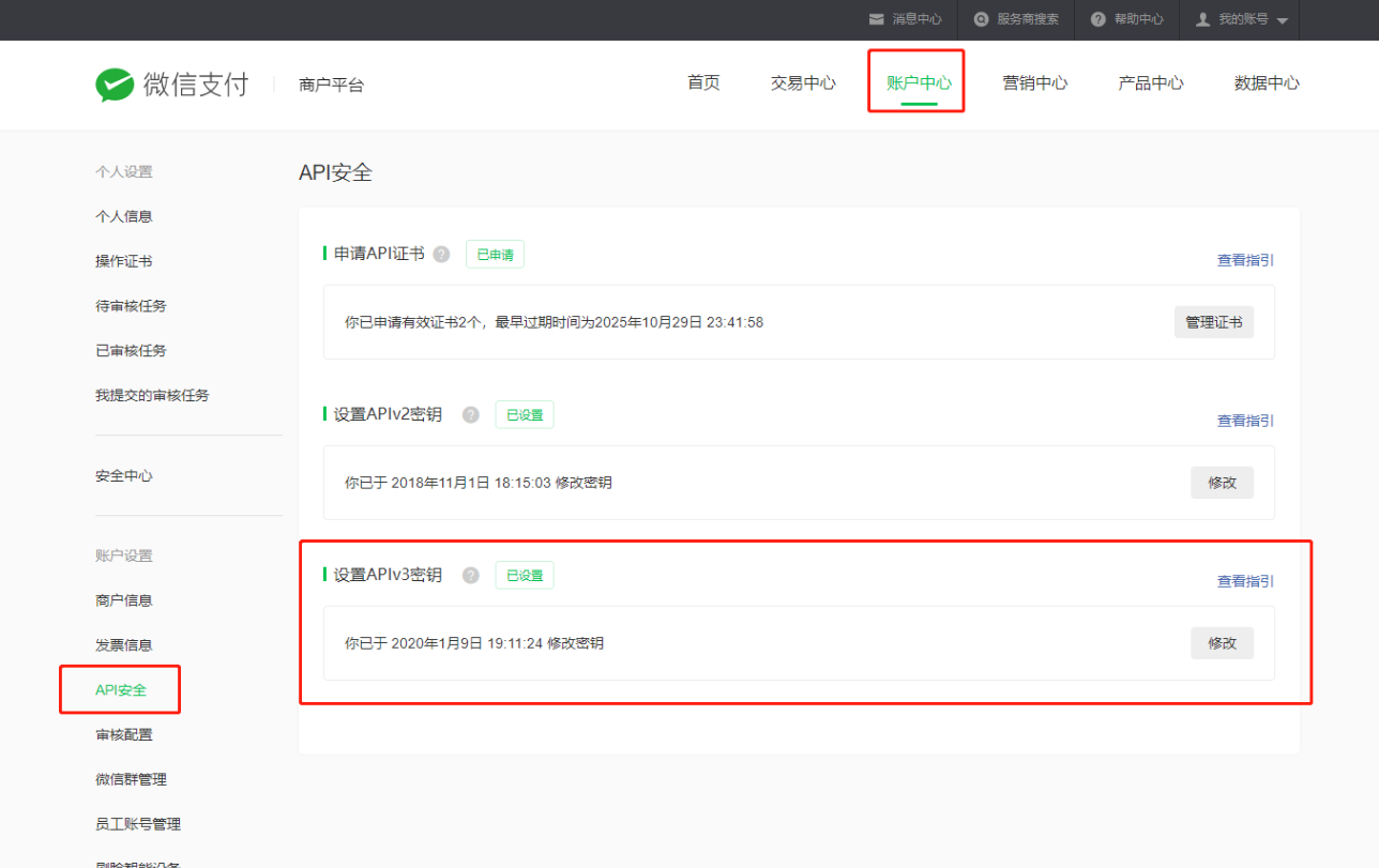 如果共用微信公众号的微信商户号,填写同一个APIV3密钥,若不是,登录各自微信商户平台设置。
