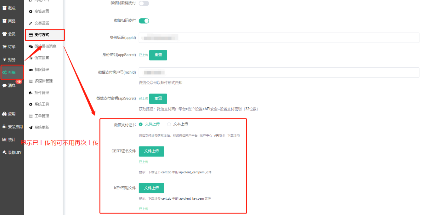 (二)使用小程序或者APP设置,一样是走商城后台 -- 系统 -- 支付方式的,